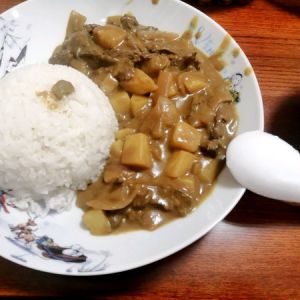 再把饭用普通碗盛好,米饭倒入碟子里,再把煮好的咖喱牛肉倒入碟子。