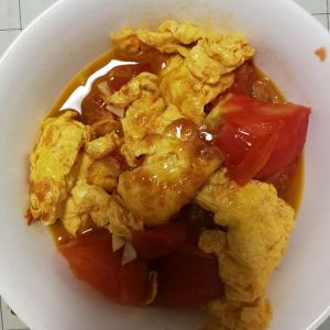 鸡蛋一面基本定型时,倒西红柿,稍稍翻炒,加水焖煮。