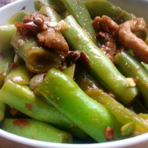 锅中倒油,加入腌好的猪肉丝翻炒,7成熟后加入青椒,放少许盐。最后加入四季豆加一碗水煮一下,同时放入蚝油,一大勺豆瓣酱和少许盐调味。