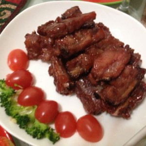 取出排骨装盘即可!为了更有食欲,可以将西兰花和圣女果摆在盘子周围做下装饰噢!美味的蜜汁叉烧排骨新鲜出炉!