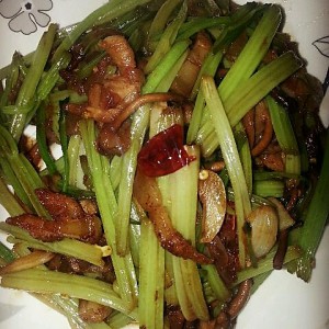 热油锅,下干辣椒、蒜片爆香,加入茶树菇、猪肉煸炒