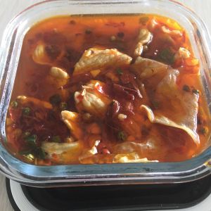 找一个容器将水煮肉片盛楚,放上干辣椒丝和葱花