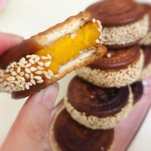 取一小块南瓜团子搓圆,取两片饼干夹在中间,轻轻捏一下夹紧。