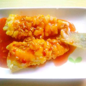 番茄酱放入糖,白醋搅匀,炒制粘稠浇在鱼身,完成