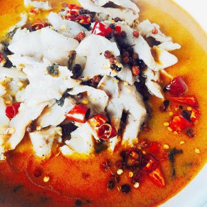 捞出鱼片、浇汤,将红椒段、花椒粒置于鱼肉上,大火烧开适量滚油浇在上面即可完成。