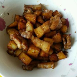 锅内少许油,花椒、姜片下锅爆香,放入炸过的五花肉和土豆块,依次放入味极鲜、盐,少半碗水,慢炖十五分钟左右,放少许糖收汁。