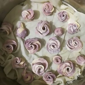 把两种面团扭在一起,弄成一个个小圆球,五片小圆片放好,中间用筷子压一下,卷起来对半扭开,摆好花瓣掰开就可以了