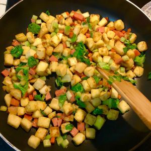 锅中放油,倒入胡萝卜翻炒,倒入西葫芦,倒入馒头丁,放少许生抽,放适量盐翻炒,倒入黄瓜火腿肠青菜翻炒几下即可