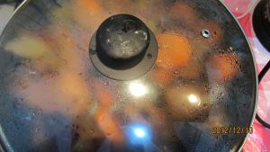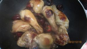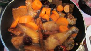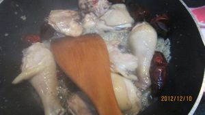 放入鸡快不断翻炒.然後放入小料,如大蒜.辣椒.八角.一起炒.炒到鸡快有咖啡色