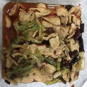 圆白菜盛出,鸡肉放在上面,放好辣椒段,麻椒,热油浇在上面,成品