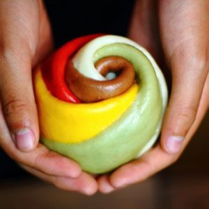 面团发酵完成后先揉光滑再分成5份,最其中4份分别加入红曲粉、抹茶粉、可可粉和南瓜泥混合揉成不同颜色的面团。红曲粉、抹茶粉、可可粉加入面团之前先滴入4~5滴清水融化开后再揉进面团中,南瓜泥直接揉进面团中,如果南瓜泥所含水分较多,建议放锅里翻炒后再使用;