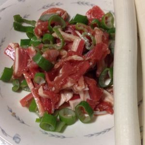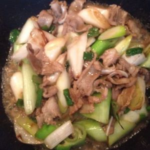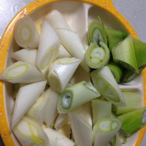 将羊腿肉速冻后切成2-3厘米宽薄片,用一点盐、料酒、生抽、一点糖、胡椒粉葱花腌10分钟