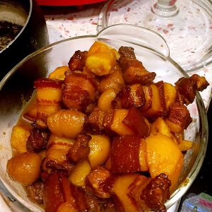 炒好后加水炖1小时左右加土豆和栗子,栗子是生着拨好放冰箱冷冻的。