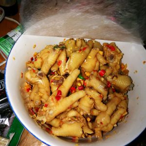 拌匀鸡爪,淋花椒油和茶油,多搅拌,隔几个小时再搅拌一下,使它充分腌制到酱汁。
