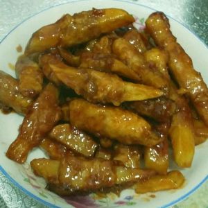 锅里加入三十毫升水、糖、醋、番茄酱、盐少许拌匀,倒入炸好的土豆条翻炒起锅
