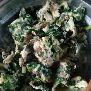 (最好小火和中火)将锅内倒入一勺油,热了之后将搅拌好的韭菜鸡蛋倒入,过十秒,翻过,避免糊锅,之后鸡蛋几乎全部成型,倒入一小碗水,放入半勺盐,如果喜欢咸,可以再放入几勺盐
