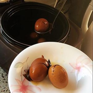 鸡蛋放入压力锅,加水末过鸡蛋,水多点没关系,放入全部调料,盐可以多加一些,比较入味,没有压力锅可以用普通的锅煮,压力锅入味快。压力锅调到闷炖就可以。煮好后放在那里不要动,或者看鸡蛋没碎的再敲敲,泡一晚,第二天早晨可以吃了。如果用普通的锅煮,可以多加水,煮过之后也要保证锅里有汤,鸡蛋可以泡在里面。
