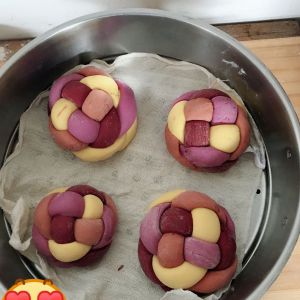 面粉200g一份,分4份,分别加入蔬菜粉,酵母温牛奶化开,我用了200ml牛奶化开,然后分成50ml一份~分别加入四份面粉中,加牛奶搅拌活成面团~面团千万不要太粘……我这些面➕化开酵母用的牛奶总计550ml……活好面团发酵至两倍三倍,加糖揉面排气~