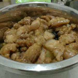 将配菜装在盆里,腌制好的五花肉覆盖在上面,放到电压力锅里按肉档隔水蒸。
