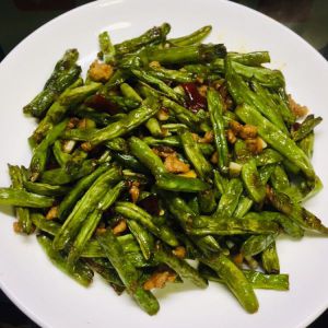 然后把炸好的四季豆倒进去翻炒,加盐生抽调味就可以出锅了。