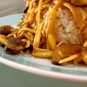 将笋丝、杏鲍茹丝、香菇丝分先后下锅煸炒。