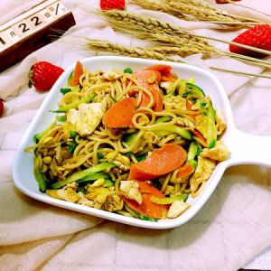 鸡蛋打散、黄瓜切丝、青蒜切末、火腿肠切片(忘拍了)黄豆芽焯水备用