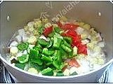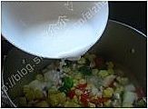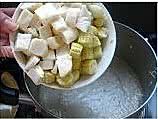 排骨汤放入锅中烧开,先下玉米笋、山药丁、香菇丁煮2分钟。