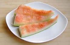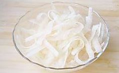 西瓜皮洗净,切去绿皮和红瓤的部分不要,切薄片,撒盐腌十分钟