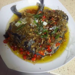 然后把刚刚的材料红辣椒青辣椒洒进去,煎至好的姜蒜也放上面,倒入3滴蒸鱼豉油,1勺鸡精,随后放入锅里再蒸20分钟