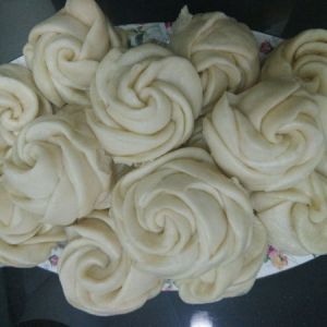醒好的面切核桃大小的小剂子,擀成圆片,不要太薄,八九个片一个压一个的摞在一起,从摞好的片正中心一字切来,然后从一边卷起,切刀的那面用手捏一下,不然花型容易散(10片---12片也可,片摞在一起的越多出来的花型越漂亮)