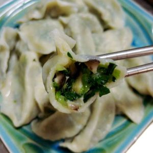 将切碎的小青菜,与炒好放凉的小葱和香菇加盐、糖、浓缩鸡汁搅拌均匀
