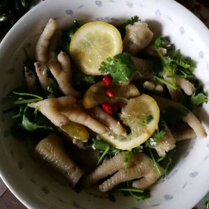 将凤爪洗净,切入姜片,蒜瓣,放清水煮8分钟左右,浸入香糟卤里并放入少许姜片,柠檬,泡椒。