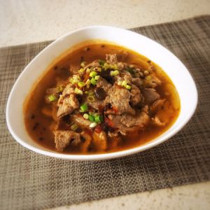 令起锅放入花椒和郫县豆瓣酱爆香,加入适量清水煮沸盛入碗中,上面放入辣椒面和葱花