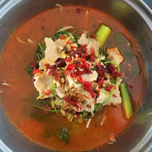 把汤倒入器皿中,上面撒上干辣椒,之后在起锅烧油,将热油浇在前面即可!