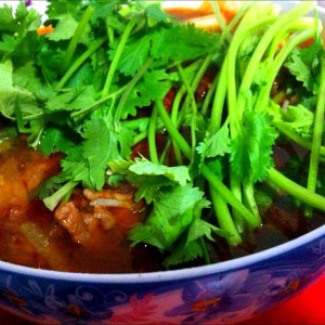肉切片,放入水淀粉,盐,调整到适当湿度搅匀待用, 一般要腌制15分钟哈!蒜拍碎,姜切成姜碎,葱打成结,芹菜切长段,香菜切长段,莴笋尖一分为四待用。