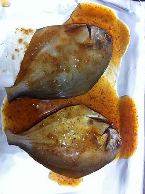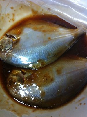 将平鱼清理干净后,用烤肉酱腌制2-3个小时,也可以腌制过夜更入味