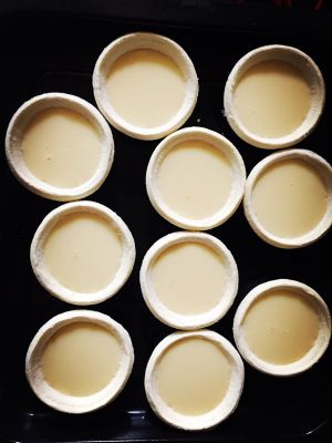 把挞水倒入蛋挞皮至八分满,烤箱210度预热烤20分钟