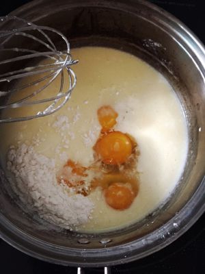 待凉了以后加入鸡蛋、面粉拌匀然后过筛两次