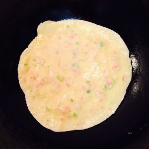 锅里倒很少的油,放一半面糊进去,用中小火,转动锅,让面糊摊开来,成饼状的时候翻个面,来回翻个两到三次面就好了。
