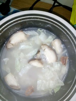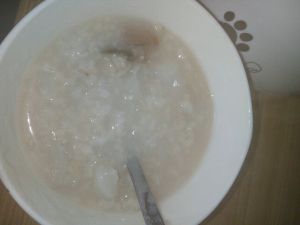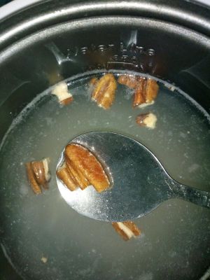 等粥差不多熟了以后,再加入盐和鸡精,粥小火慢炖,因为有加了碧根果,所以粥有股奶香味(⊙o⊙)哦