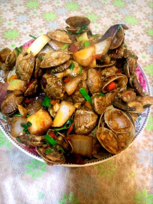 锅里下油烧热,放入花椒,豆瓣,姜末,蒜末,炒香后放入花甲,一直翻炒2-3分钟再次放入蒜末,洋葱块,翻匀后再放入耗油,和小米辣继续翻炒40s后,放入葱段,香菜段,翻匀起锅