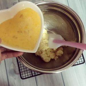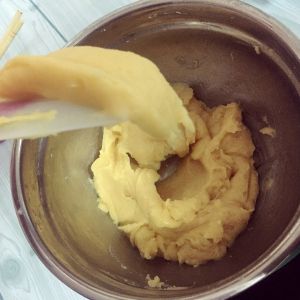 等面糊不烫手了开始加入鸡蛋,首次少加一点。拿铲子拌匀。后边分两次加入搅拌均匀。