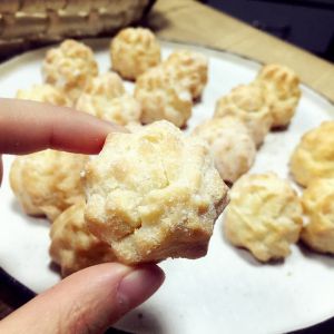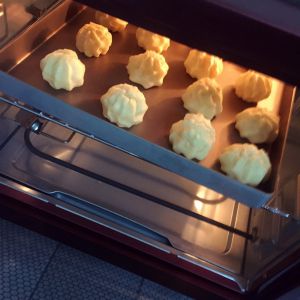 烤箱预热210度,烤12分钟左右。当泡芙膨胀起来后,烤箱温度调到180度,继续烤20-30分钟。烤到花纹有点棕色就可以出炉了。