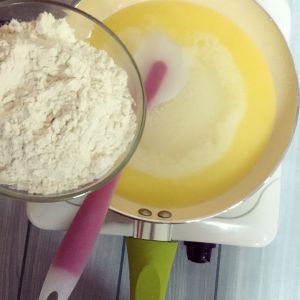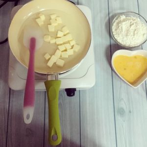 把水,盐,糖,黄油一起倒入锅内。中火加热搅拌。