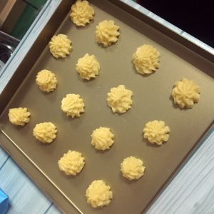 开始挤泡芙。由于面糊比较硬不建议用一次性裱花袋哦。用菊花形的花嘴把面糊挤在烤盘上。