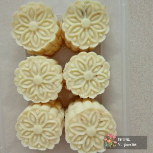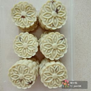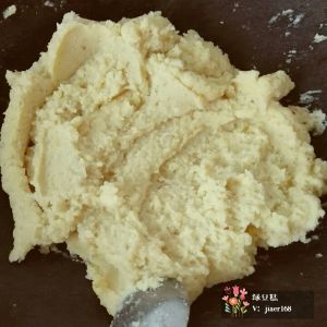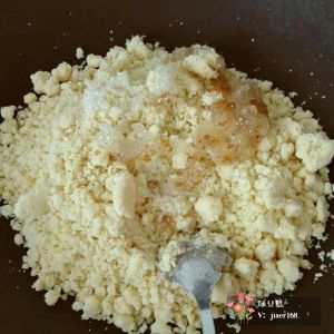 在锅里倒入黄油,白糖,糖桂花和绿豆蓉,小火翻炒。