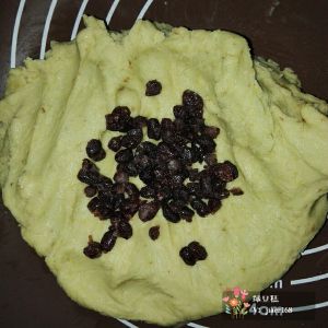 揉均匀的绿豆泥里加入适量蜜红豆继续揉均匀。