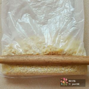 将蒸好的绿豆装入保鲜袋,用擀面杖细细地碾碎。