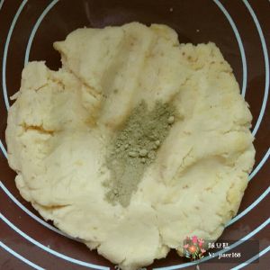 把炒好的绿豆泥分成2份,拿其中一份加入抹茶粉,揉均匀。