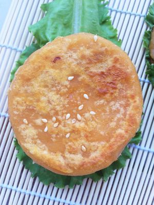 然后把面团按扁成大饼状 拿圆口容器扣出小饼 电饼铛里放少许油 一烙就好啦 过程中上面可以撒少许芝麻